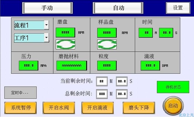 2)單工序模式:根據(jù)每一步磨拋工序,可設(shè)置和調(diào)用30種工序參數(shù):磨盤(pán)和磨頭轉(zhuǎn)動(dòng)速度、磨拋時(shí)間、水通斷……
