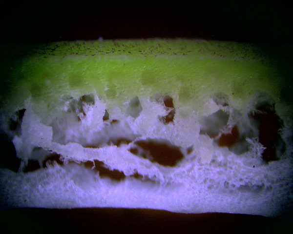 葉肉細胞崩潰瓦解時好似也一定的規(guī)律, 使葉片的切面呈現(xiàn)格子狀的圖案
