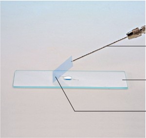 2. 制好標(biāo)片后,即在蓋玻片上的一端滴上染劑,再?gòu)牧硪欢艘晕埼ザ嘤嗳緞┘纯。?br />