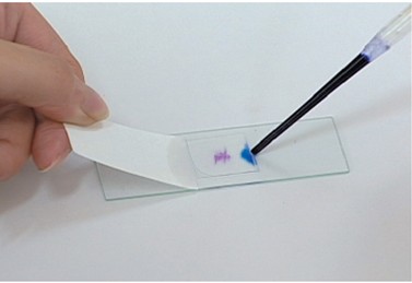 1. 制作標(biāo)本時(shí),直接將染劑滴于標(biāo)本上,染劑量要少,可在上好染劑的玻片的反面以細(xì)水流沿著玻片一端往下流過(guò),帶走多余的染劑。