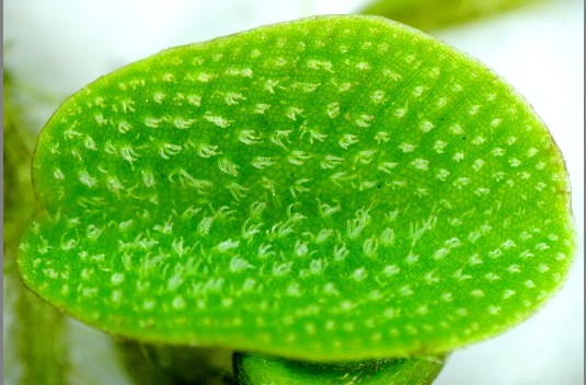 槐葉蘋葉片上突起的細(xì)毛~四根細(xì)毛基部叢生成一束,頂端分叉。